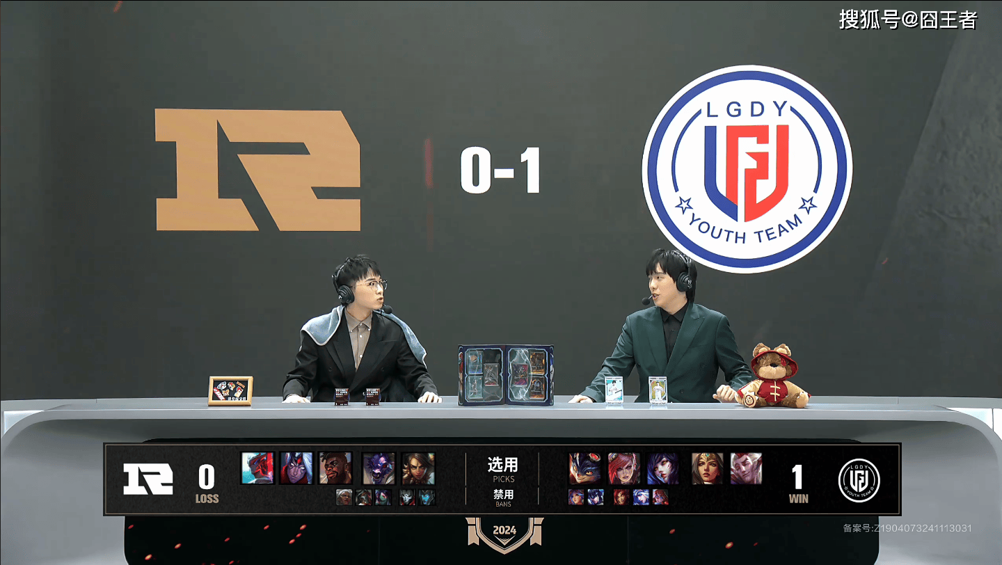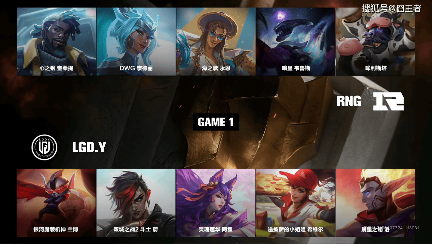这一局比赛,RNG蓝色方,禁用安蓓萨、烈娜塔、阿卡丽、烬、滑板鞋,选用奎桑提、豹女、永恩、韦鲁斯、牛头;LGD.Y红色方,禁用阿萝拉、艾希、婕拉、猪妹、莉莉娅,选用兰博、蔚、阿狸、希维尔、洛