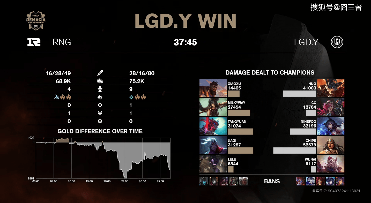 这一局比赛,双方除了前10分钟略作纠缠之外,LGD.Y直接打出了碾压局。5分钟左右,Lele牛头果断Q闪W先手,配合队友收下狐狸一血;11分钟左右:Nuo兰博化身龙坑战神拿下三杀;19分钟左右:Lele牛头配合永恩完美先手,但RNG众人状态不佳被打成4换2;23分钟左右:Xiaoxu奎桑提TP绕后效果不佳,LGD.Y打出0换4收下大龙;30分钟左右:RNG多打少拿下大龙,但Nuo兰博完美大招击杀RNG三人;最终37分45秒:LGD.Y团灭RNG,赢下本局比赛。