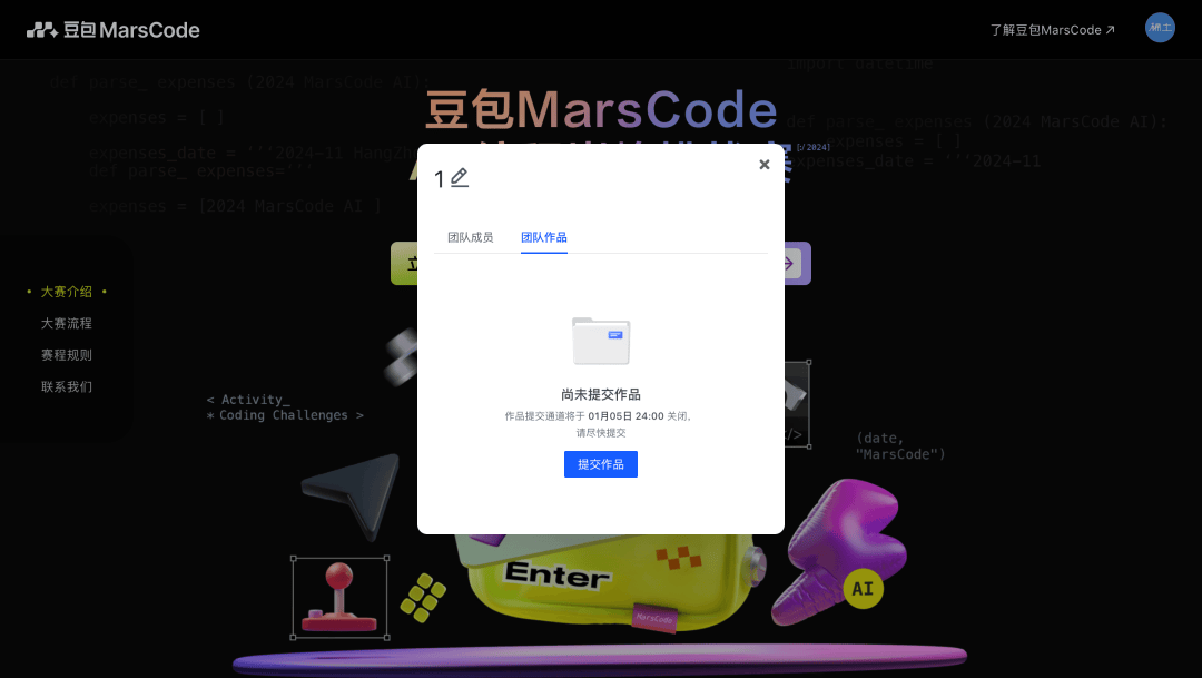 登陆大赛官网-点击我的团队按钮-弹窗选择团队作品-点击提交作品