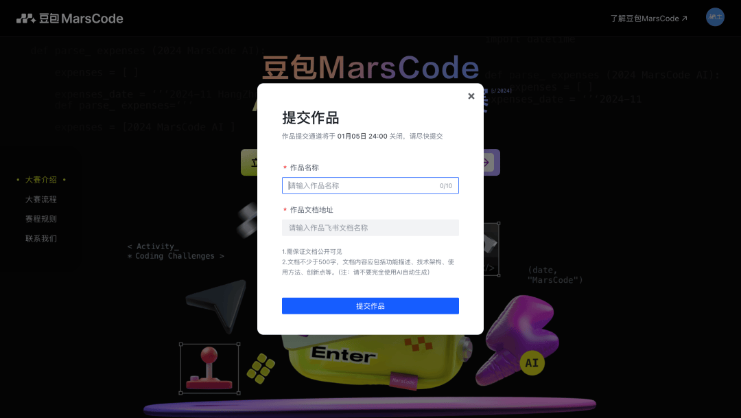 输入作品名称和文档-确认提交作品。