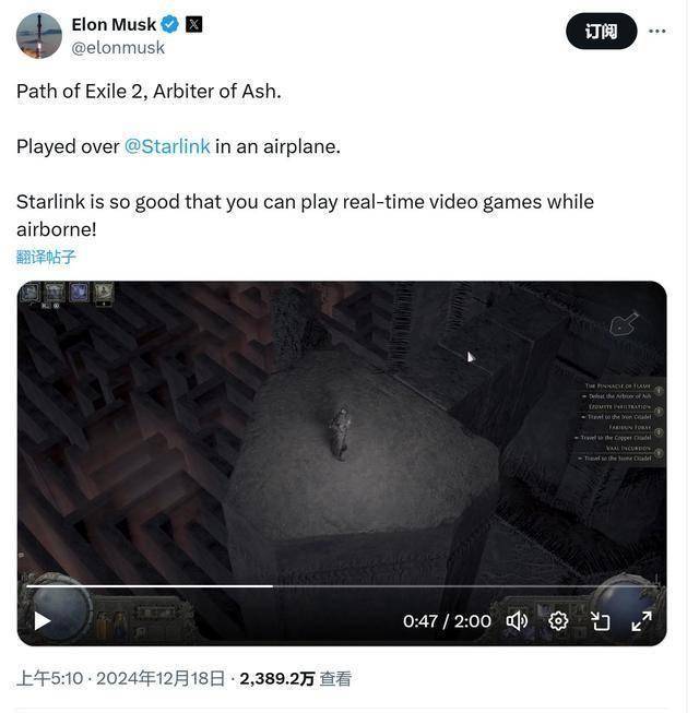 埃隆·马斯克近期在其个人社交媒体平台X上发布了一段视频,瞬间引起了广泛关注。视频中,他身处飞机内,却通过星链(Starlink)卫星互联网,流畅地玩起了《流放之路2》这款热门游戏。