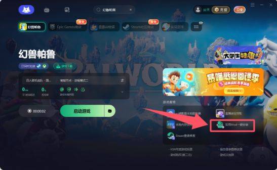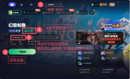1.在 暴~喵~上 方搜 索《幻兽帕鲁》并一 键加 速,点击游戏名称下方的【游 戏下 载】按钮,下 载MOD前 置文 件。暴~喵~不 仅可 以加 速该游戏,还能同 时加 速Steam和Xbox 平 台。