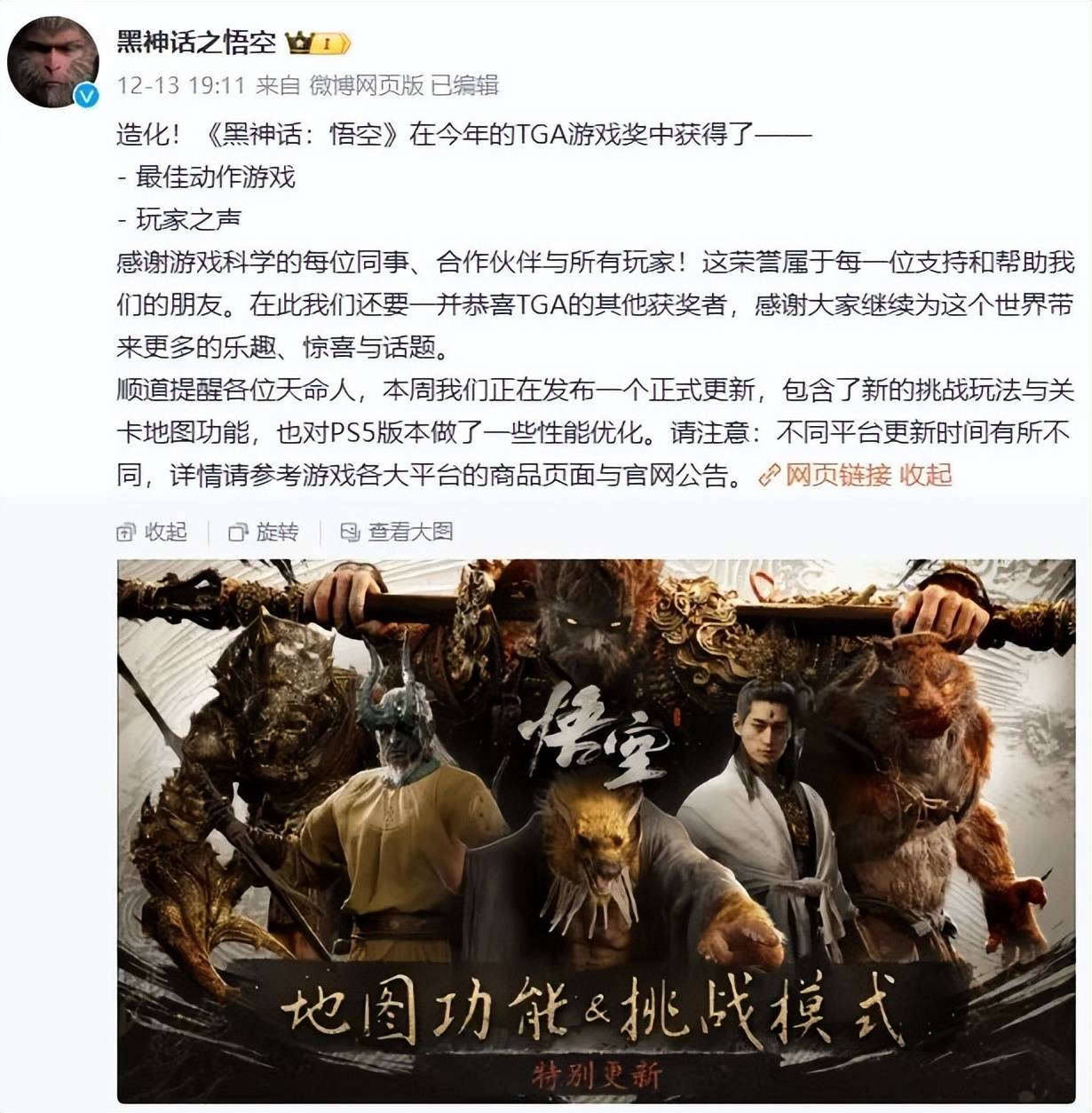 就在游戏茶馆办公室楼下超市刚摆上联名产品时,大洋彼岸的《黑神话:悟空》(以下简称黑神话)又传来捷报:TGA典礼上,黑神话荣获“最佳动作游戏”和“玩家之声”两项大奖,创下国产游戏新纪录。翌日,《黑神话》制作人冯骥发布长文回应表示, “路还很长,我们一直在变强。”