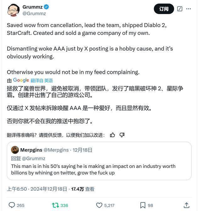 在被指责50多岁一事无成后,Grummz反驳了这名玩家,他说:“我曾拯救了《魔兽世界》,避免它被暴雪取消,带领了团队,推出了《暗黑破坏神2》、《星际争霸》,创建并出售了自己的游戏公司。只靠X发帖就把觉醒3A游戏拆得七零八落是我的爱好,而且显然很有效。否则你就不会在我的推文中抱怨了。”