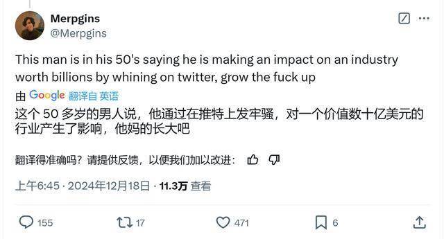 他的这一发帖获得了43万次观看,证明有了不小的影响力,评论区有大量玩家感谢Grummz。但也有玩家称“这个人都50多岁了,竟然还说仅在X上发牢骚就对价值数十亿美元的游戏行业产生了影响,赶紧TM地快长大吧。”