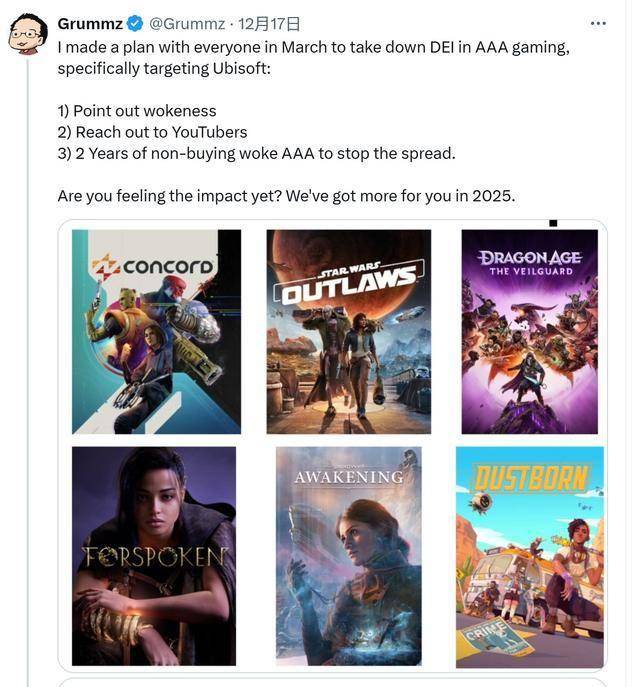 近日知名反Woke推主Grummz(真名Mark Kern)在X上发帖,晒出自己今年的“成绩单”。他说今年3月才计划干掉3A游戏中的DEI,尤其是针对育碧。显然他已经收获颇丰,在其影响下,一些大作比如《星鸣特攻》、《星球大战:亡命之徒》、《龙腾世纪:影障守护者》都遭到了大量玩家的抵制,导致这些厂商损失惨重。