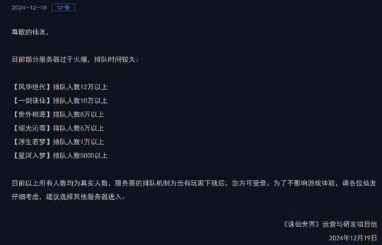 对此,《诛仙世界》官方也是公布了目前人气比较火的六个服务器,依次为风华绝代、一剑诛仙、世外桃源、瑶光沁雪、浮生诺梦与星河入梦。其中,最火的风华绝代服务器排队人数已经飙升到了12万以上,这也是为什么玩家们迟迟看不到排队进度减少的原因,庞大的排队人数直接就把这个服务器给挤爆了。