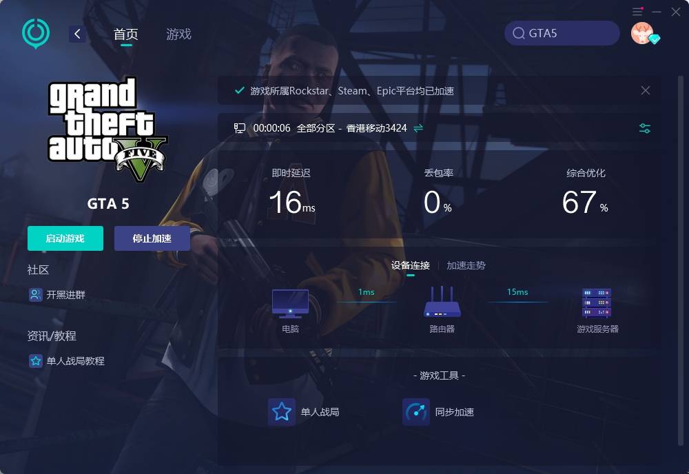 点击进行网络优化,完成后即可获得一个稳定的网络连接,就能启动畅玩GTA5