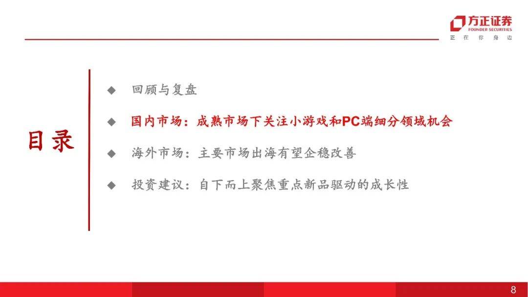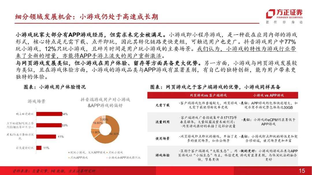 关注小游戏和PC端细分领域机会。1)小游戏:我们认为与网页游戏发展类似,小游戏满足用户碎片化及轻量化等需求,转化链路更快更短,可触达用户也更广,同时小游戏在用户体验、留存等方面具备更大优势,预计小游戏市场规模可超过700亿元,当前仍属于渗透率低位。2)PC游戏:客户端游戏本身在精品内容层面的优势成为其稳定表现的根源,尤其在视听体验、操作反应、内容丰富度等层面具备手游难以替代的优势。此外,不同于移动游戏,客户端游戏以品牌营销为主要营销模式,预算与成本相对可控,同时客户端游戏整体用户趋于稳定,近五年客户端游戏市场营销费用率均保持在6%的水平,远低于手游端游。