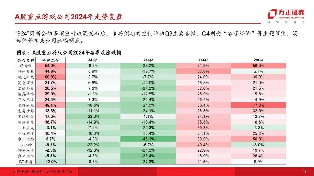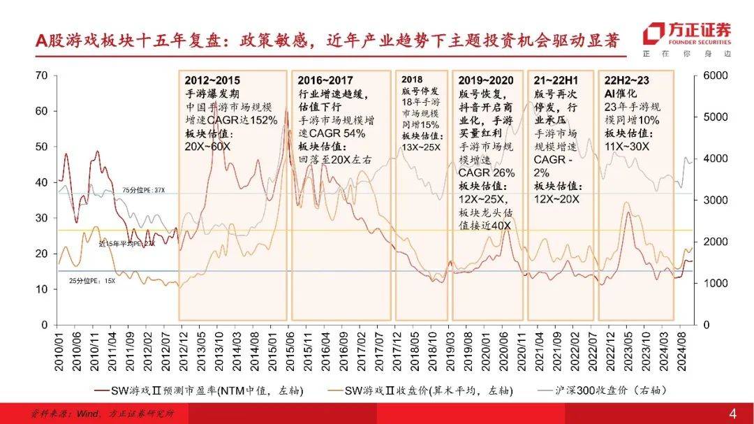 回顾与复盘:A股游戏板块政策敏感,近年产业趋势下主题投资机会驱动显著。A股游戏板块估值波动相对较大且政策敏感,近年来随着行业成熟,市场规模增速趋缓,板块更多由主题性机会推动。而港股游戏板块估值波动相对较小,走势更多由公司业绩推动。2024年上半年A股游戏板块因弱产品周期、缺少强产业催化,整体表现相对平淡。“924”国新会推出多项重磅政策发布后,市场预期的变化带动Q3主要涨幅,Q4则受“谷子经济”等主题催化,汤姆猫等相关公司涨幅明显。
