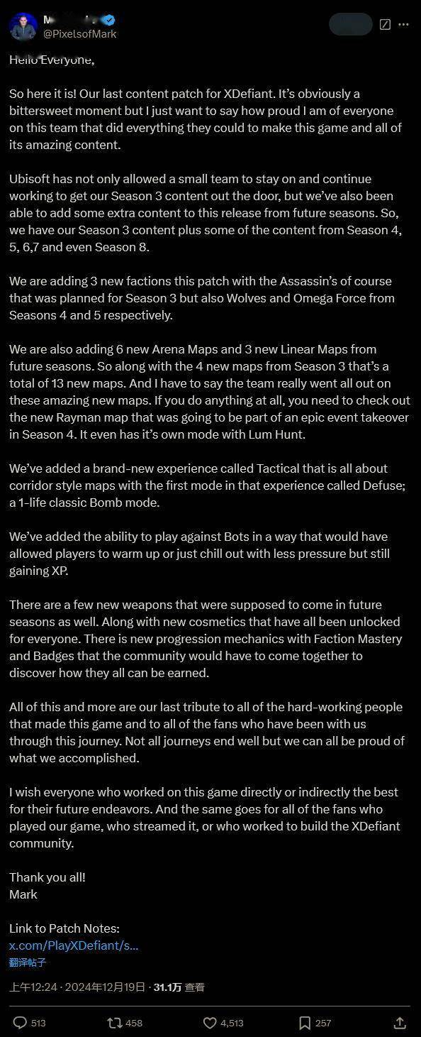总监在推特上发帖解释道:“育碧不仅允许一个小团队留下来并继续努力推出我们的第 3 赛季内容,而且我们现在还能将未来版本中的额外内容加入游戏。