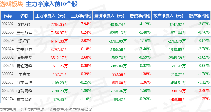 从资金流向上来看,当日游戏板块主力资金净流出1.89亿元,游资资金净流出2915.59万元,散户资金净流入2.18亿元。游戏板块个股资金流向见下表: