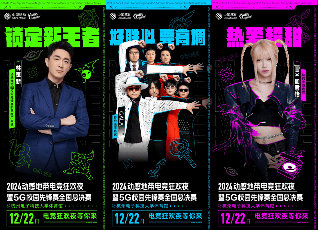 近年来,动感地带一直致力于深入年轻人圈层以数智能力助力潮流文化破圈。12月22日晚,2024动感地带电竞狂欢夜的舞台将迎来动感地带5G校园先锋赛明星推广大使林更新、摇滚乐队GALA和说唱音乐人Jinx周君怡。他们将与观众一同见证全国总冠军战队和橙络络官方coser的加冕时刻,也将为高校电竞爱好者献上精彩的舞台表演、开展趣味互动,与线上线下动感地带粉丝共享一场电竞狂欢盛宴。