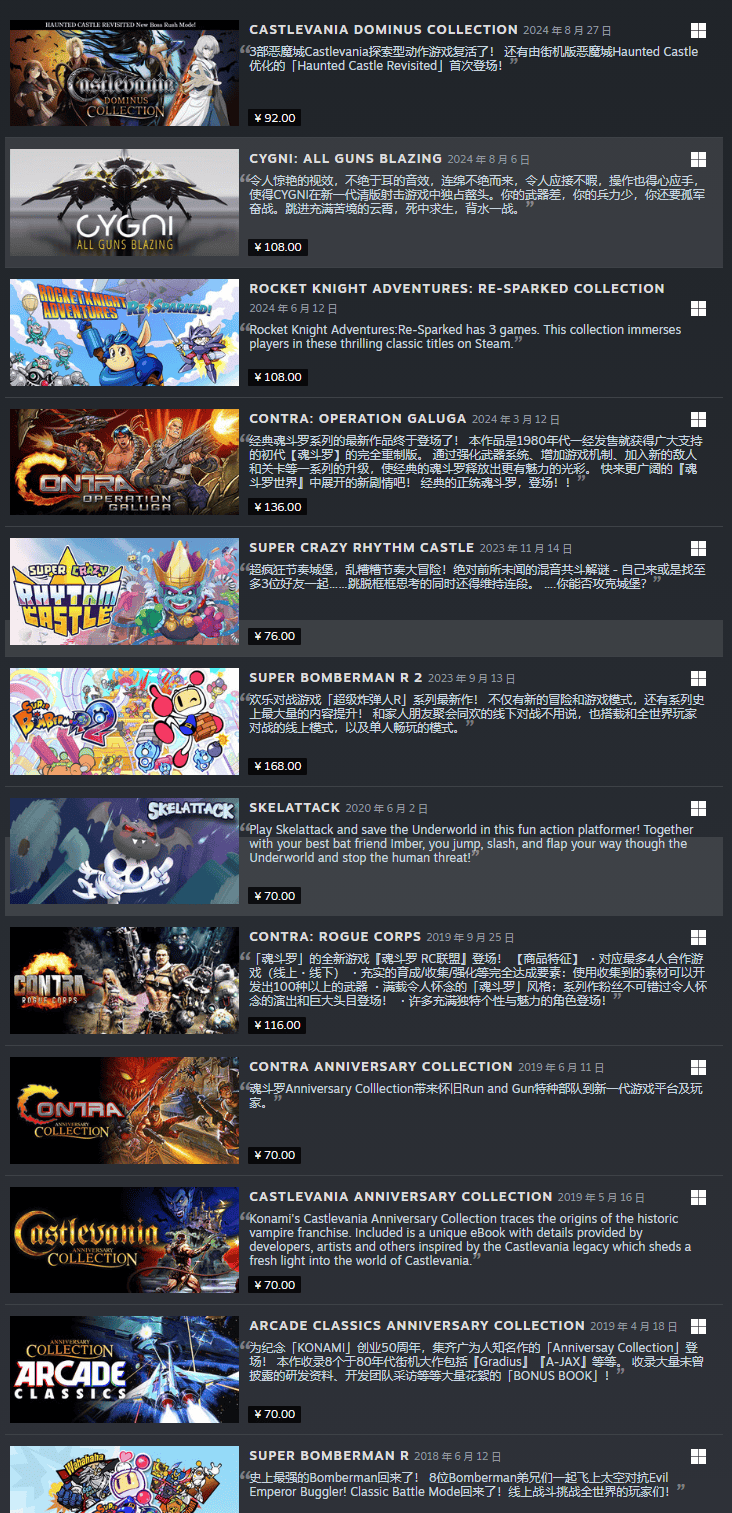 近日,游戏发行巨头科乐美(KONAMI)在Steam平台上的部分经典游戏作品,突然面向中国玩家解锁,引发了广泛关注。此次解锁的游戏涵盖了多个知名系列,如《恶魔城》、《魂斗罗》、《炸弹人》的部分作品,以及备受期待的《幻想水浒传1&2》高清复刻版合集。