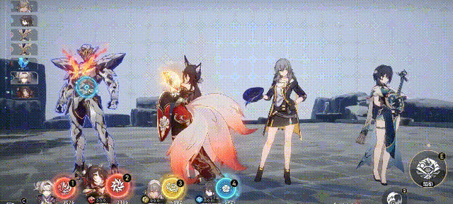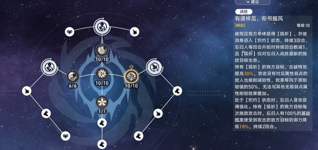 忘归人最重要的技能是她的战技,战技有三个效果,第一个效果让自身进入“炽灼”状态(强化普攻),第二个效果让我方一个角色获得“狐祈”,持续3个回合,忘归人每回合开始时持续回合数减1。