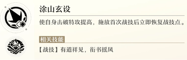 释放该技能后忘归人可在进入战斗时第一个行动,搭配上“涂山玄设””首次释放技能回点的能力,就可以让忘归人开局无消耗的给队友释放“狐祈”。