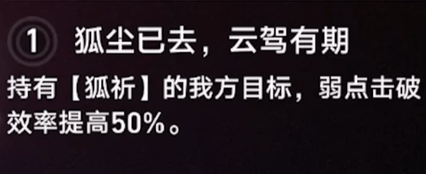 第三个效果是让获得“狐祈”的角色击破特攻得到提高30%,且在攻击没有对应弱点的敌人时也能进行削韧,效果等同于原削韧值的50%。