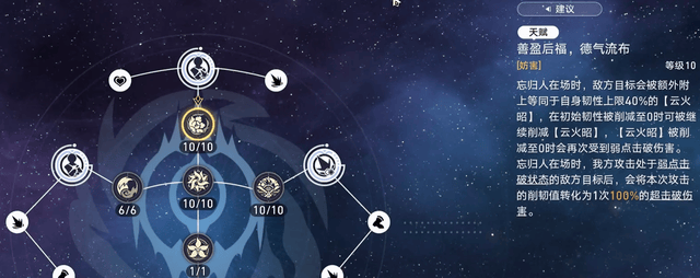 第一个天赋“善盈后福,德气流布”,该被动的效果和同谐主开启大招的效果一样,可以将削韧值转化为超级破伤害,并且这两个角色的超击破伤害还能互拐和叠加。