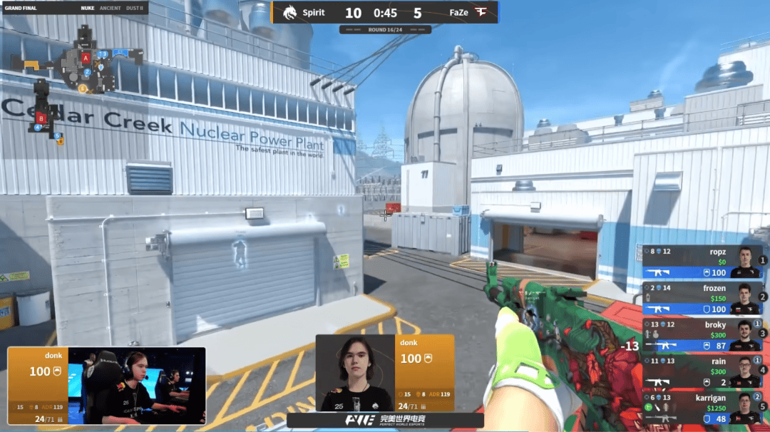 赛事期间,V社不得不临时发布补丁,削弱大拉的优势。可这并没有影响donk的发挥,他还在杀,带着Spirit高歌猛进打入总决赛,跟FaZe一较高下。