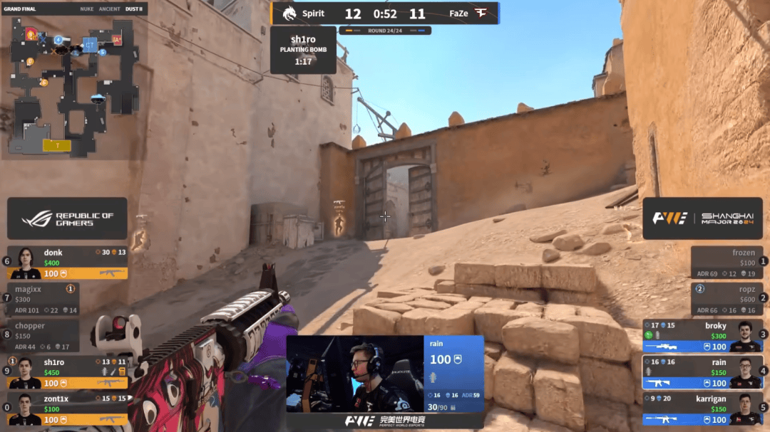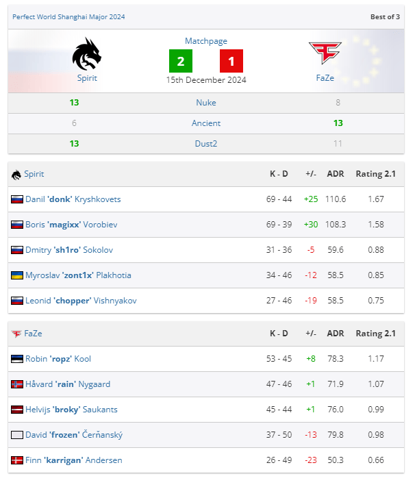 然而这时的FaZe也在Spirit的猛攻之下濒临极限,连选手的手都在发抖。FaZe并非没有准备回防B点的战术策略,但他们没能丢好一颗关键的烟雾弹。尽管Karrigan亲手击毙了心魔donk,但在短短数秒内发生的快节奏对枪中,是Sh1ro代表Spirit活到最后,终结了这场精彩程度足以载入史册的BO3。