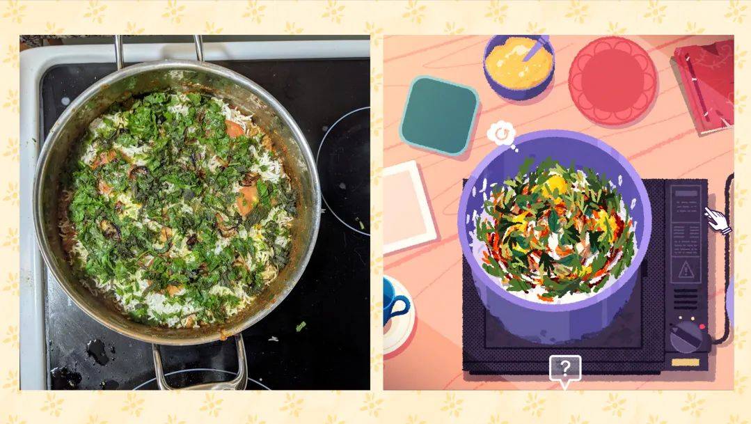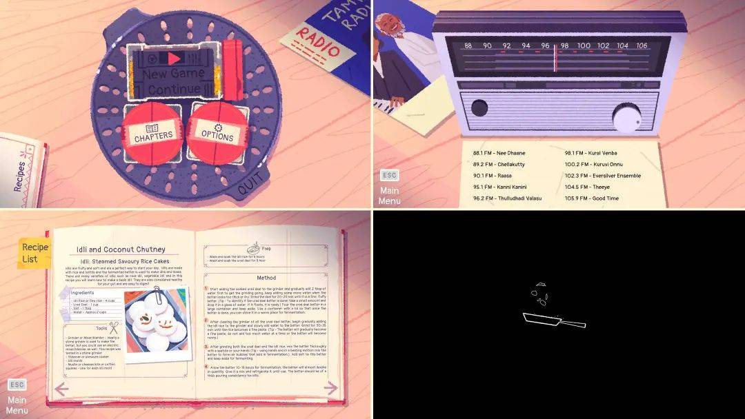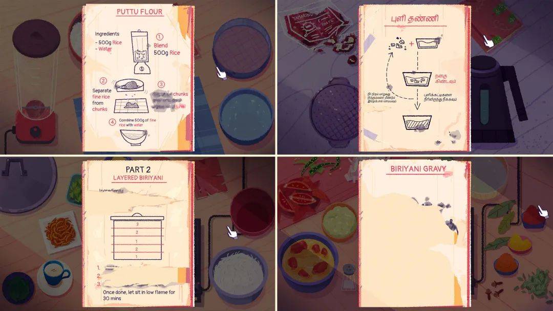烹饪解谜环节更是声色俱全。对于美食游戏,玩家无法隔着屏幕闻到或品尝菜肴,余下的听觉和视觉便尤为重要。开发团队(工作室名为 Visai Games)致力于还原真实的厨房氛围,亲自按游戏中的各个食谱烹饪,音效设计师妮哈·帕特尔(Neha Patel)同时录制过程中的声音,无需任何编辑,即可作为音效素材使用。有趣的是,背景声是一台收音机正放着曲子,带着些嘶沙杂音。为了强调地域背景,其中包含不同时代的泰米尔本土电影配乐,以呼应游戏内数十年时间的变迁,也是在向团队从小喜爱的配乐师们致敬。据阿比吉斯回忆,小时候家里的厨房没有一刻是安静的,妈妈总是开着收音机或电视作背景声,这成为了记忆的一部分。