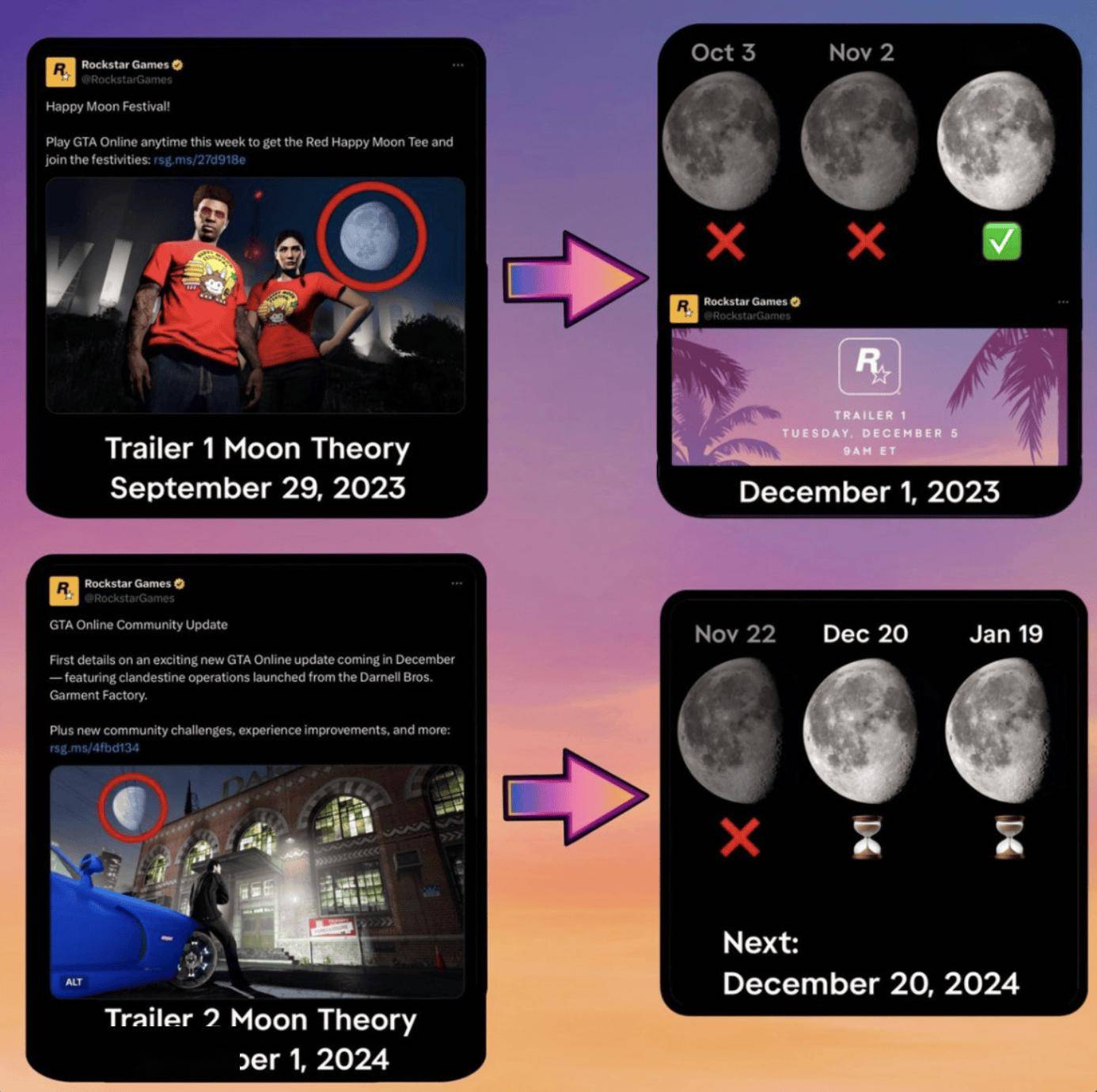 而根据 Reddit 平台最新“分析证据”,有玩家从《GTA Online》历年万圣节活动更新海报中找出线索,发现由于两场活动海报中背景月象不同,认为这代表 R 星暗示《GTA 6》第二部预告片将在相关月象盈亏周期之间(本月内)公布。
