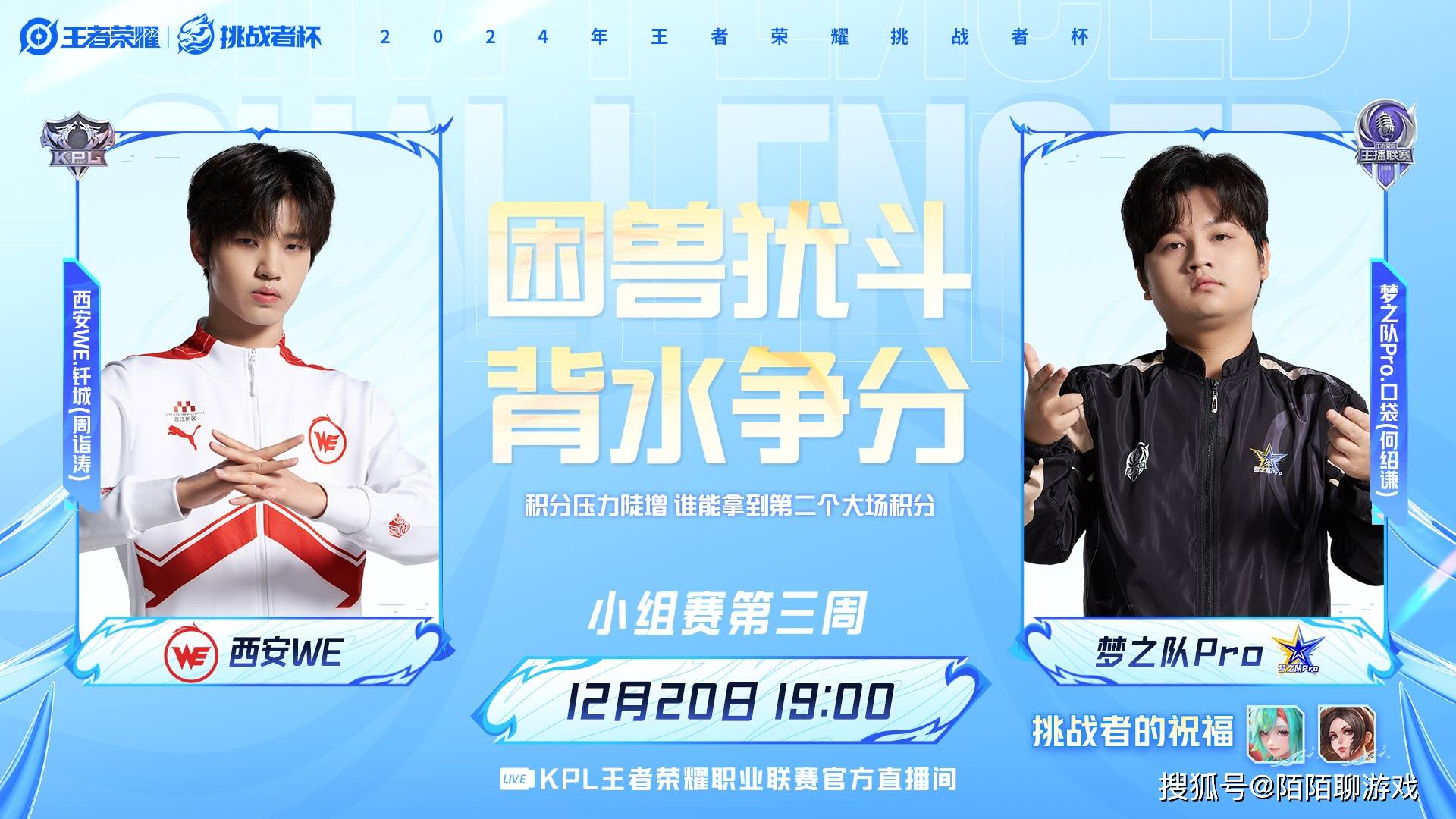 WE在上一场的2-1战胜了第一的DRG,在前两场KPL内战全输的情况下拿到了救命的一分。虽然目前WE仍然以1胜2负-2净胜分的成绩,排在4组的第五,但与第四的梦之队Pro就只差1个净胜分,只要能够任意比分取胜即可实现反超。梦之队Pro在上一场对阵狼队的比赛里,虽然吃到了一笙的“辅助妲己红利”,但还是1-2输掉了大场。四支晋级挑杯的主播队伍,就只剩梦之队Pro这个独苗。他们能否在爆冷战胜WE,为主播赛道争取一个淘汰赛名额呢?