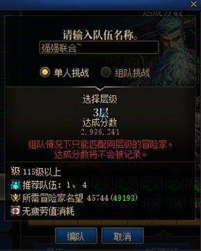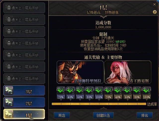 初始从1层开始,可以选择组队或者单人挑战,通关后解锁下一层,未通关则按血量获得奖励。