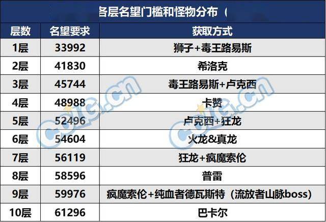 奇数层分布为2个BOSS+1个小怪图,偶数层只有一个大BOSS。本月的名望要求和怪物分布如下: