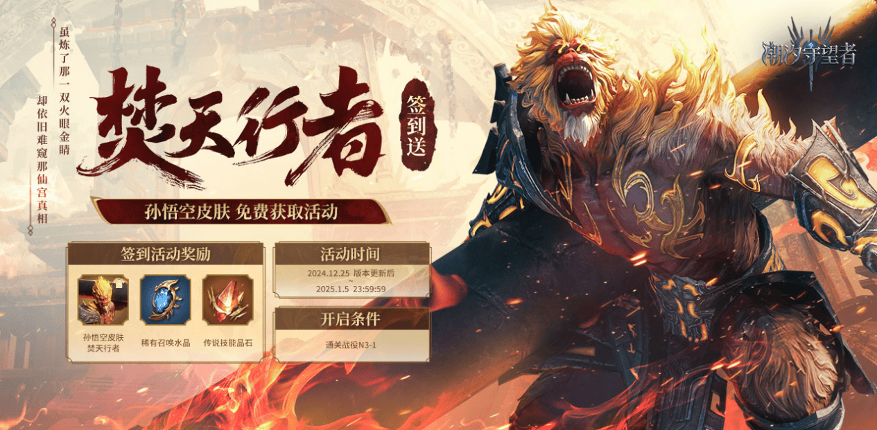 接着来瞧瞧这次主题活动。12月25日版本更新后累计登录即可获得传说技能晶石、稀有召唤水晶等丰厚奖励,更有大奖「孙悟空皮肤:焚天行者」。是的,你没有看错,皮肤免费送!这还没完,积极参与孙悟空主题系列活动,还可以获取等量70抽,神器也免费送哦!有了神器和福利的加持,孙悟空的战斗力那不得蹭蹭往上涨,让你的游戏之旅如虎添翼。你仿佛置身于神话中的花果山,与孙悟空一起大闹天宫、降妖除魔。更全新地图和趣味玩法,痛击地精、记忆翻牌,充满了趣味性和挑战性。