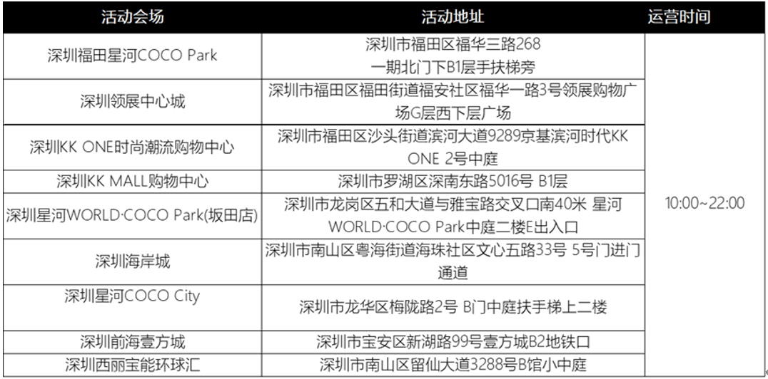 在深圳各处,共有12个集章点,每一个集章点都有一只宝可梦等你探索。此外,在其中9个集章点处,还设有巨大卡牌,来参加“宝可梦卡牌探索之旅”找到设置在深圳各处的卡牌并与其合影吧!活动时间:12月7日至22日10:00~22:00