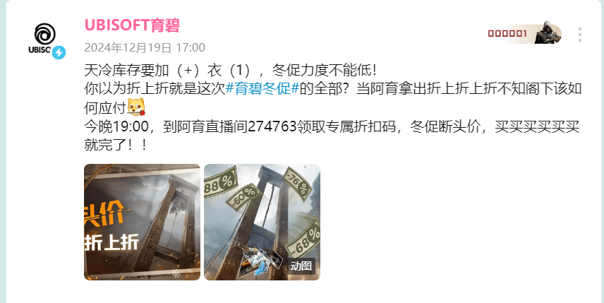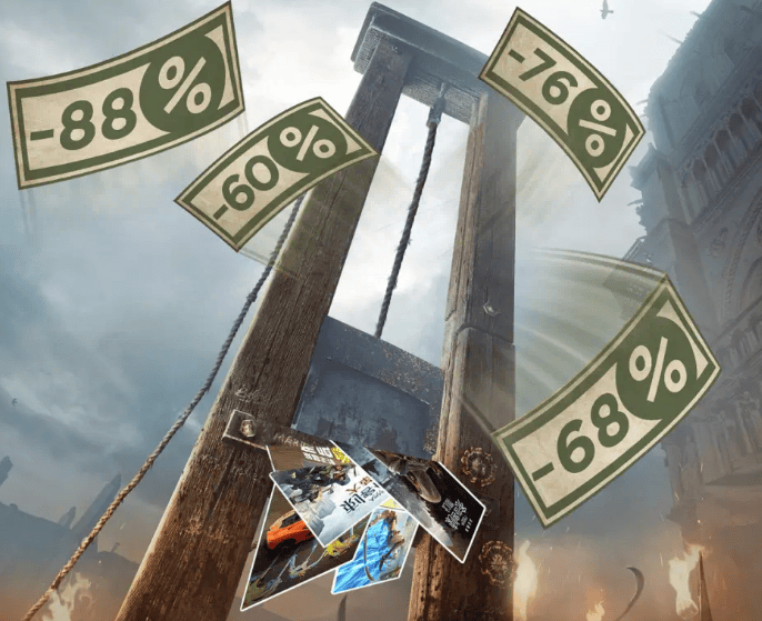 昨日,育碧的B站官号发布了一条动态,为冬促活动持续加码。其中的文案,用上了“断头价”这样的描述以及相应的配图。如果搁在其他游戏平台,这就是跟“骨折优惠”般的夸张描述。但作为一个法国的游戏公司,育碧的这波操作就很容易引发大家的联想了。