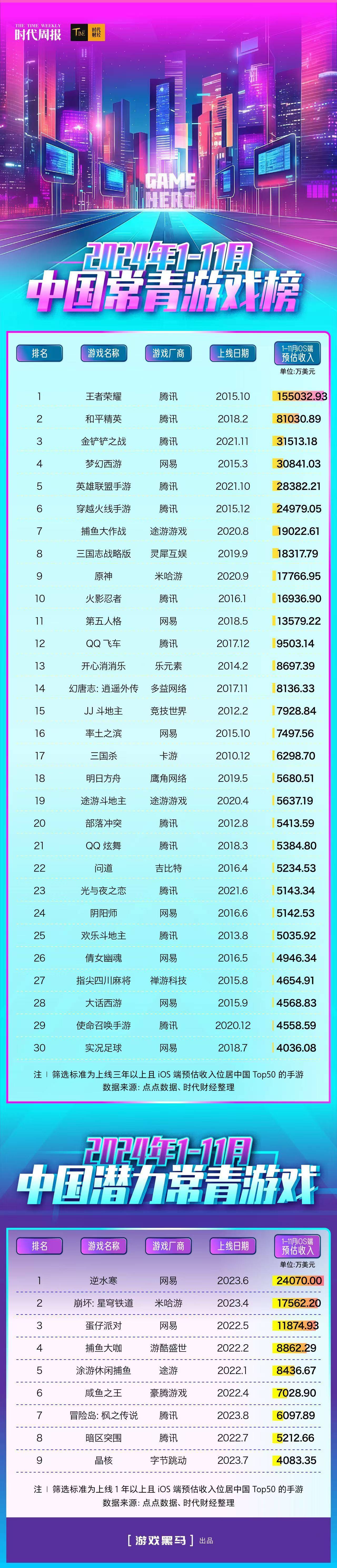为系统性梳理常青游戏的表现情况,时代财经以上线三年以上且iOS端预估收入跻身中国地区Top 50为筛选标准,统计并发布了《2024年1-11月中国常青游戏榜》。数据显示,共有《王者荣耀》《和平精英》《梦幻西游》等30款游戏上榜。