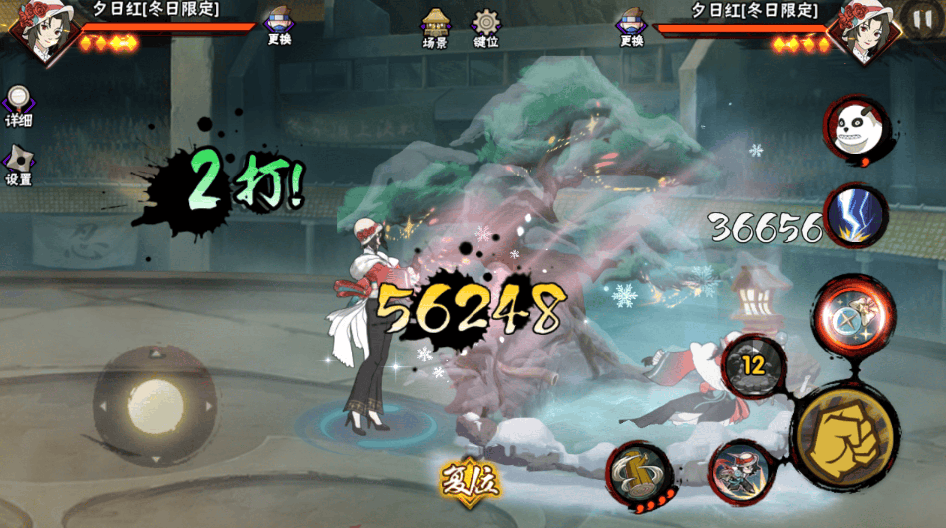 然后再来说一下冬日限定夕日红的上手体验和实战效果,跟当初看爆料的时候感觉不太一样,甚至是有很大的差异。刚开始看冬日限定夕日红,一技能有无敌位移,二技能抓取,墙角反向释放二技能还有本体消失的无敌,奥义又是全程抓取不可替身。这些特性确实存在,但忍者的其他方面也会影响到她的整体体验,感知比较明显的就是她的前后摇。普攻起跳后下落就是大后摇,而且打出第四段就必须打完第五段,不然你第四段落地后想要再用普攻衔接就接不到,如果有技能或者秘卷等其他东西倒是可以取消这个后摇。