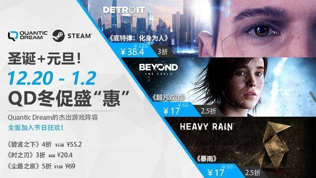 如今,随着冬季促销活动的到来,Quantic Dream再次为玩家们带来了惊喜。无论是喜欢科幻题材的《底特律:化身为人》,还是偏爱心理悬疑的《超凡双生》和《暴雨》,亦或是想要探索未知的《碧波之下》和穿越时空的《时之刃》,玩家们都能在此次促销活动中找到心仪的游戏。