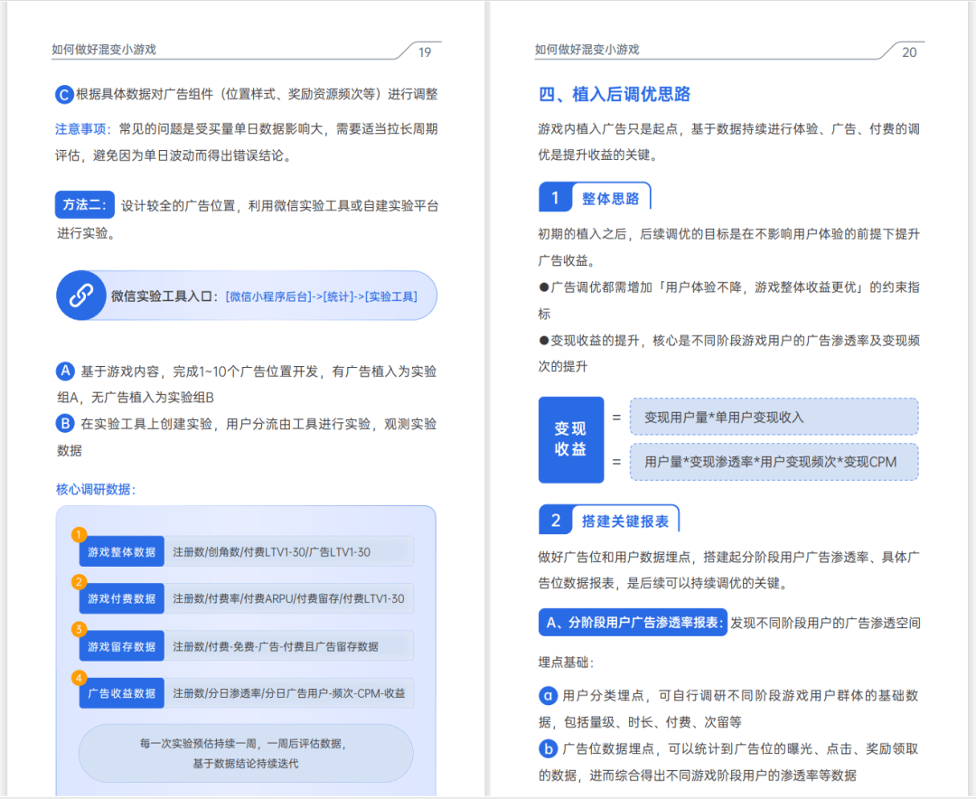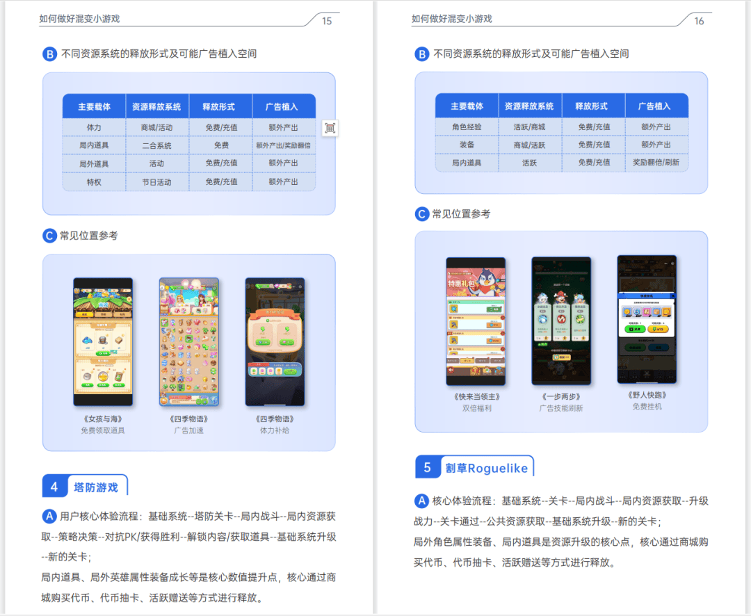 这次生态峰会的节点,腾讯广告终于整合近一年的研究成果,推出了《2024小游戏混合变现商业化白皮书》,其中详细记述了 如何清晰认知混变的定位,设计混变产品的原则、混变可能遇到的误区,以及针对卡牌、模拟经营、二合、塔防、肉鸽等不同品类, 如何量化和设计广告,乃至如何投放等。