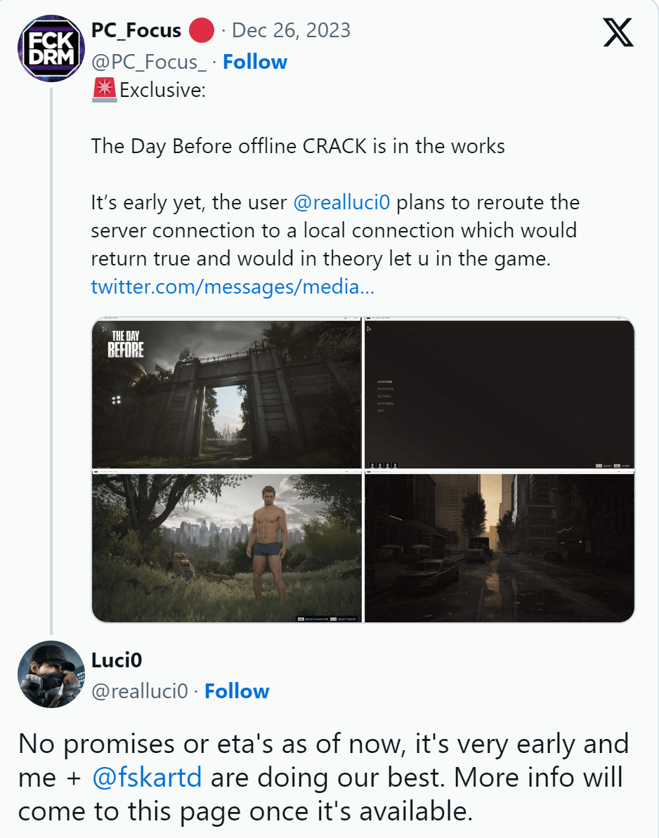 推特主Luci0和fskartd正在开发这个离线补丁,确切来讲是破解补丁,在断开服务器的情况下让玩家进入游戏。但奇怪的是为什么还有人想玩《浩劫前夕》,这甚至“不是一款游戏”。