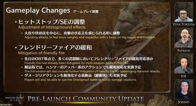 正式版中还将修复试玩版中举起武器时出现的怪表情问题,并增加私人集会所和小队集会所功能。关于新的公测,目前仍在讨论中,但由于本次介绍的武器调整将通过首日补丁更新,因此即使有新公测,也可能不包含这些调整。