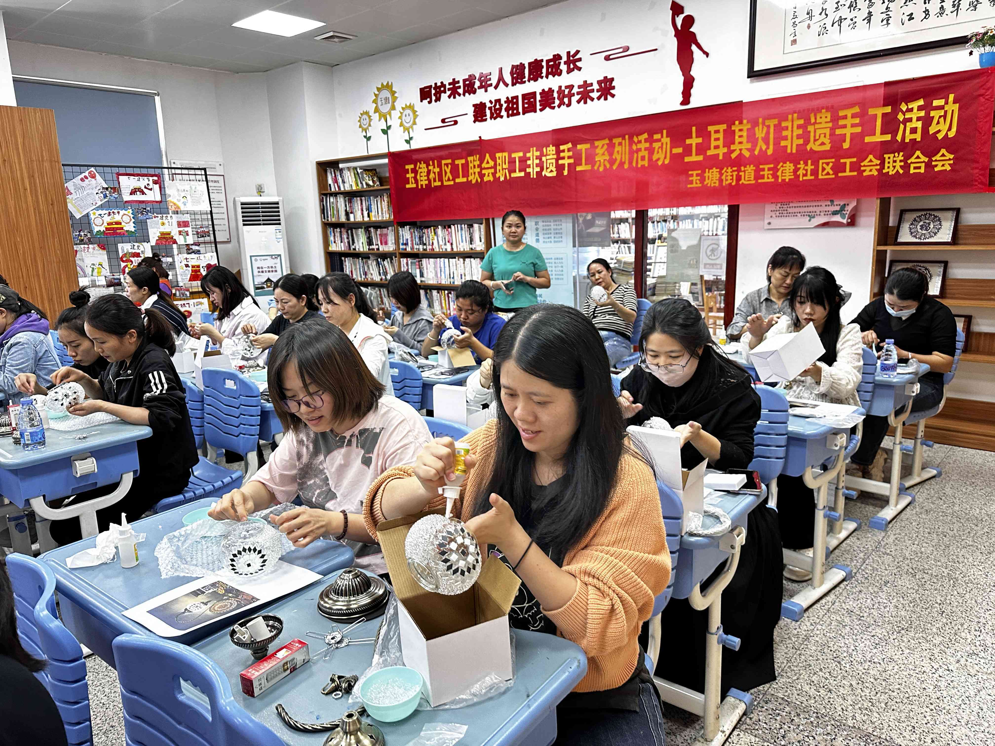 近日,光明区玉塘街道玉律社区工联会连续开展三场“巧手慧心,绽放光彩”非遗手工系列体验活动,职工们现场制作掐丝珐琅及土耳其氛围灯,感受非遗手工的指尖艺术魅力。