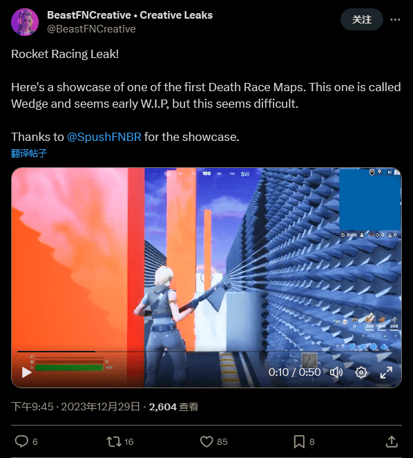 他还在另一篇推文上分享了目前仍然在制作中的“死亡竞速”模式地图“Wedge”的实机画面,显示玩家将在两边墙壁布满尖刺的紧凑赛道中一决高下。