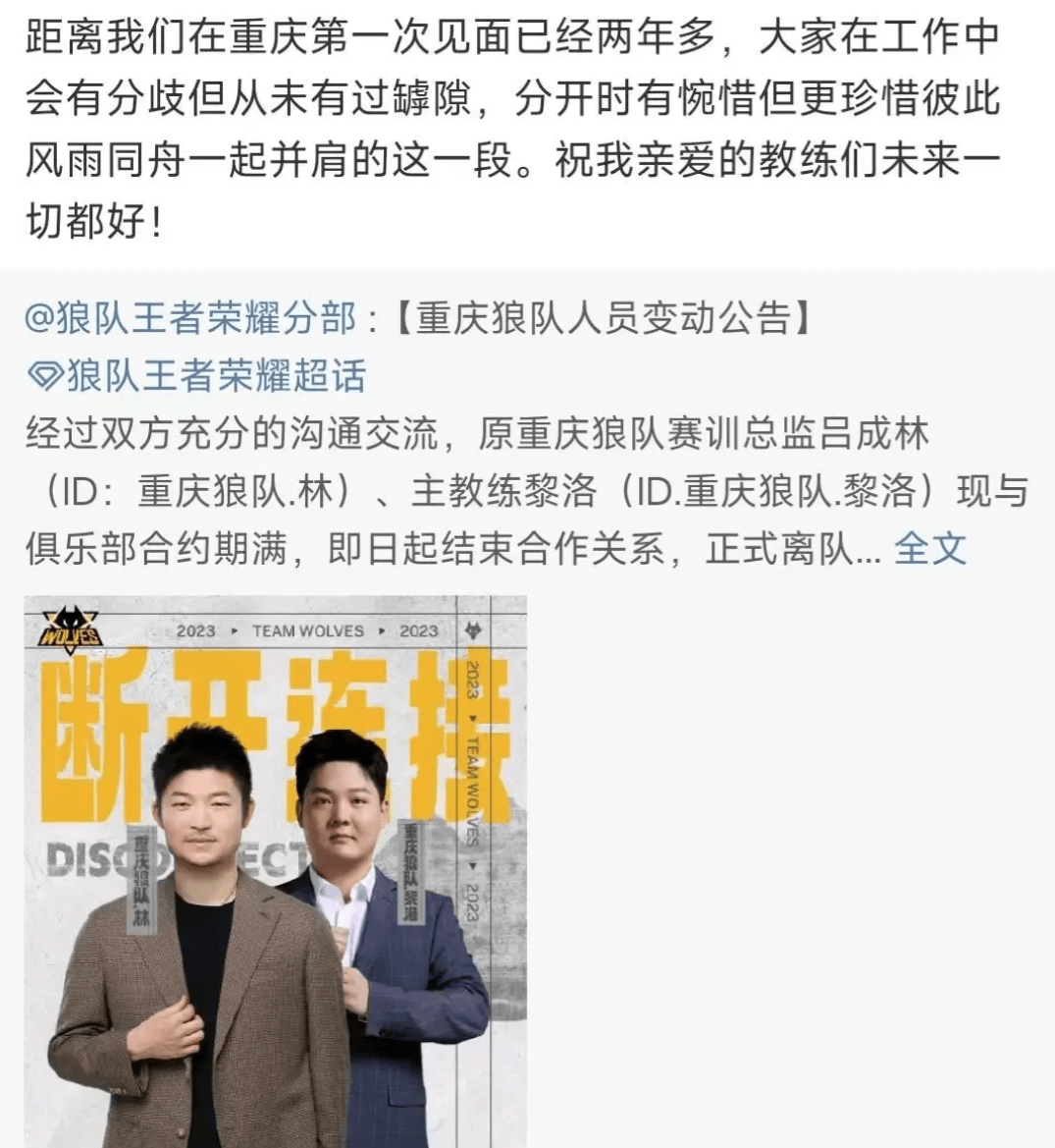 林教练又哭了,这一次不是太孤独了,而是要离开狼队了。当狼队在KIC被WB淘汰,他离队已是板上钉钉。网传林教练和狼队签约了对赌协议,拿不到冠军就离开,如若说法为真,那么老林就是被妖刀打走的,妖刀在KIC的表现不够亮眼。不过传言已经被证实为假,老林团队离开只是合约到期,他不续约了,他要去新的地方证明自己。