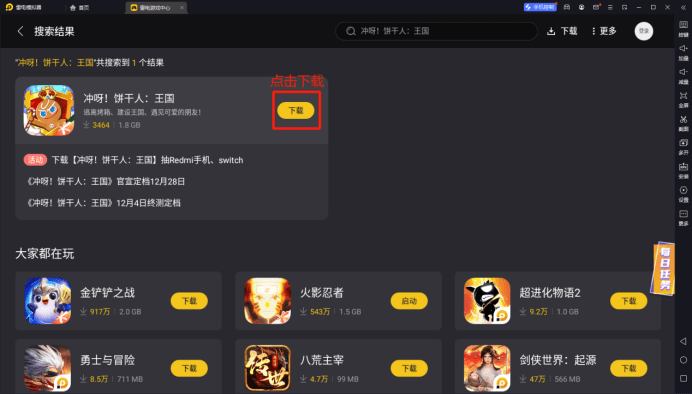 下载安装完毕后,在首页搜索框中搜索“冲呀!饼干人:王国”,直接点击下载即可。