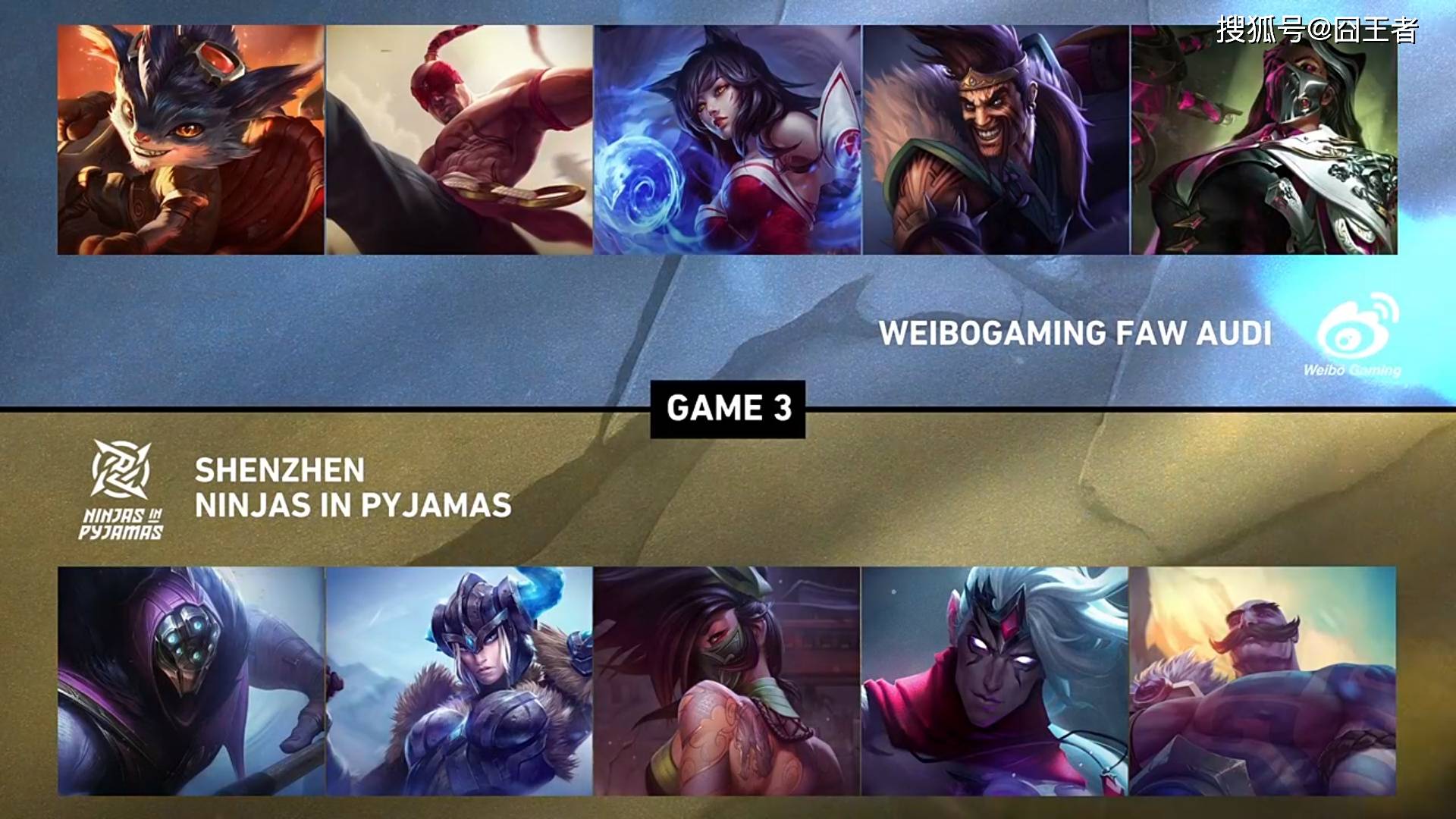 第三局比赛,WBG蓝色方,禁用滑板鞋,梦魇,妮蔻,赛娜,洛,选用兰博、盲僧、阿狸、德莱文、烈娜塔;NIP红色方,禁用艾希,妖姬,卢锡安,塞拉斯,沙皇,选用武器大师、猪妹、阿卡丽、韦鲁斯、布隆。