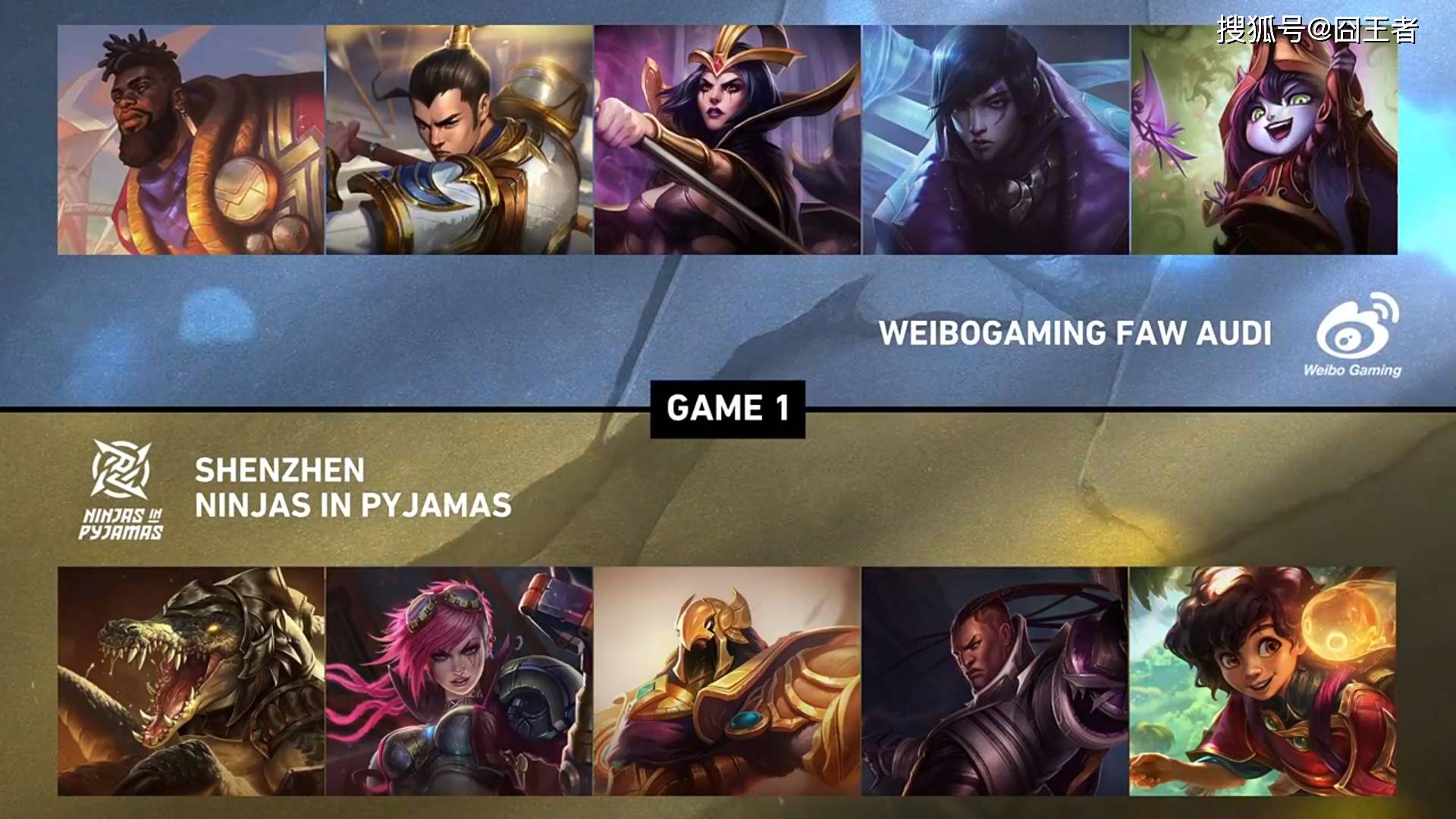 第一局比赛,WBG蓝色方,禁用滑板鞋,梦魇,兰博,阿狸,妮蔻,选用奎桑提、赵信、妖姬、厄斐琉斯、璐璐;NIP红色方,禁用艾希,盲僧,武器大师,波比,男枪,选用鳄鱼、蔚、沙皇、卢锡安、烛