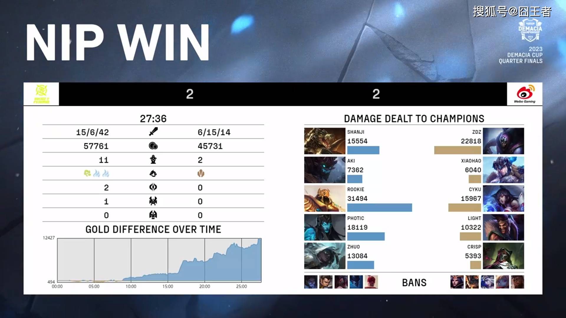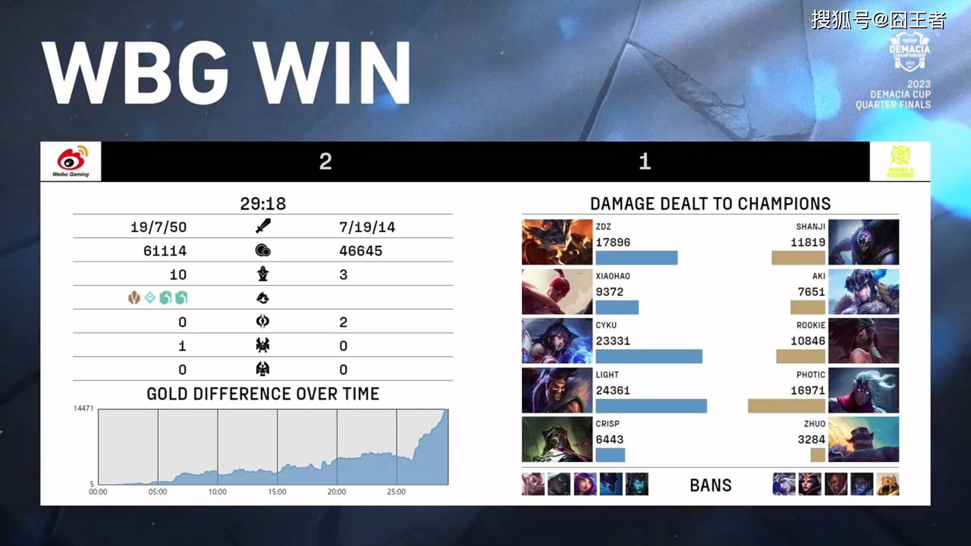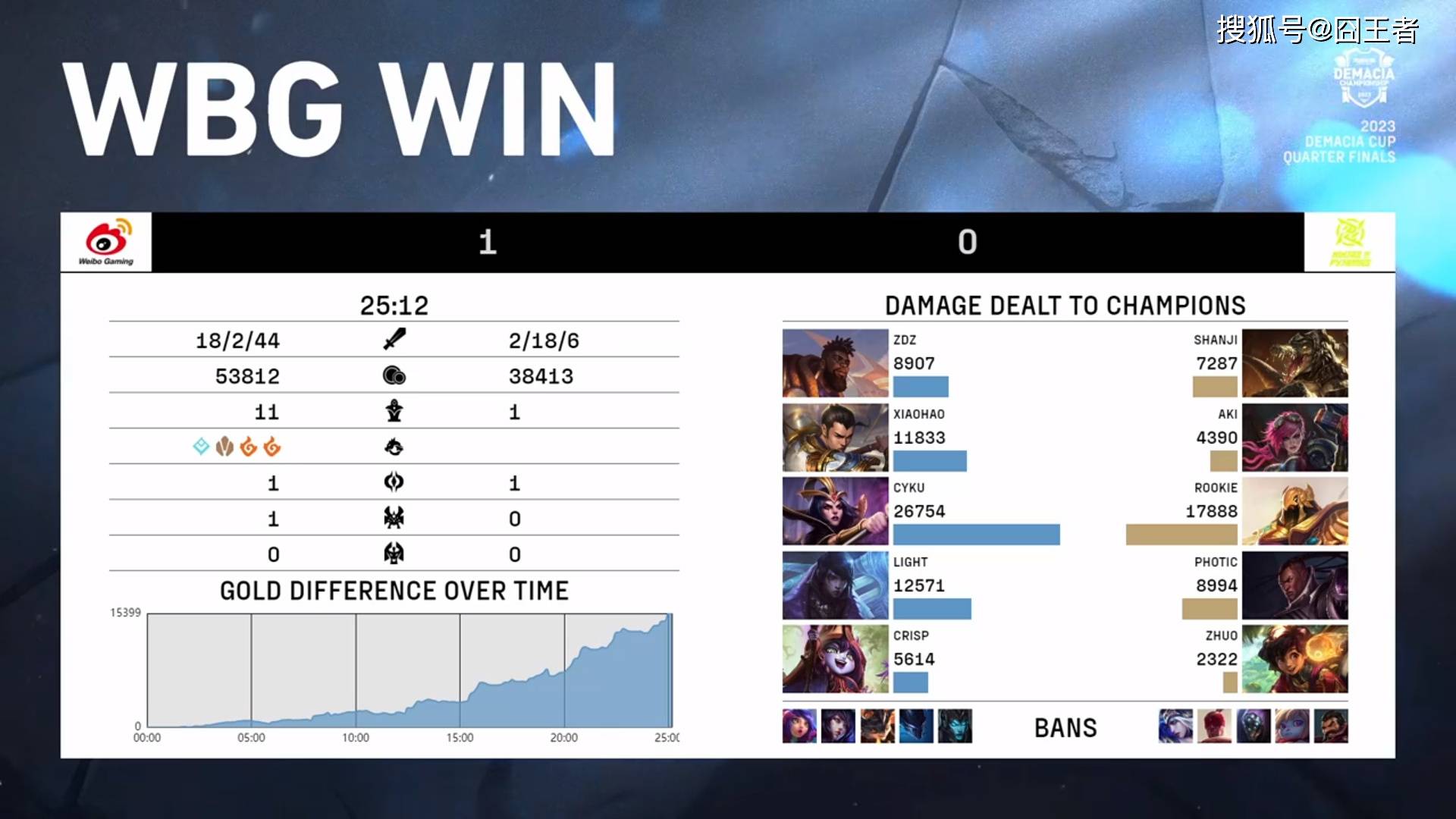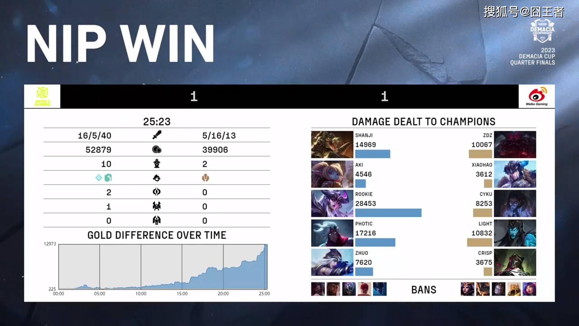 结果拿到了前期强势阵容的WBG,在开局10分钟左右,就利用针对沙皇的战术,确立了优势。随后的时间,就进入了WBG滚雪球时间,25分12秒,NIP在经济完全落后的情况下,放手一搏,全员追杀妖姬,但被WBG高歌猛进,一波先赢一局。