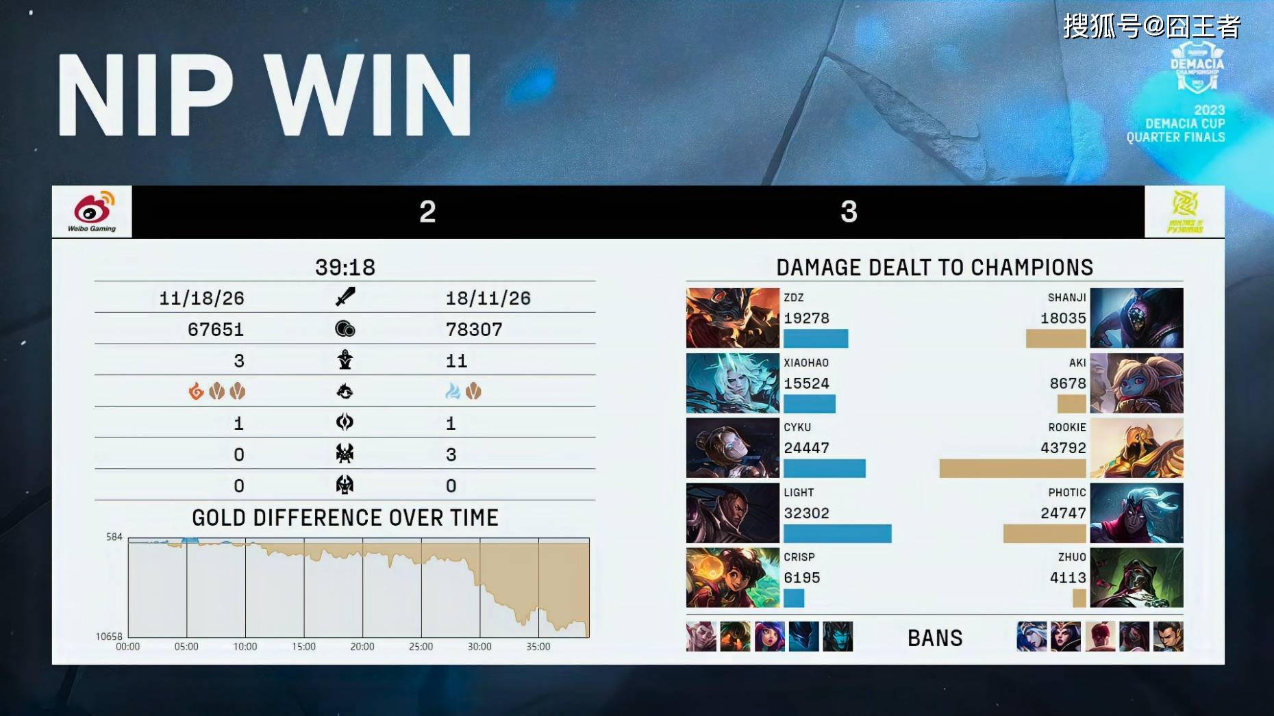 结果最后一局中,双方在前20分钟打得异常胶着,尽管NIP经济领先,但始终无法摆脱WBG的追赶,将优势转为胜势。转折点出现在22分钟左右,NIP在付出两人和小龙的代价后,斩获大龙,随后NIP携大龙Buff推进后,成功的打破僵局。中后期虽然WBG守住几波攻势 ,但他们单带线的劣势,让WBG根本反攻不出去。最终39分18秒,NIP依靠三路持续推进,随后正面团战取胜,艰难反败为胜。