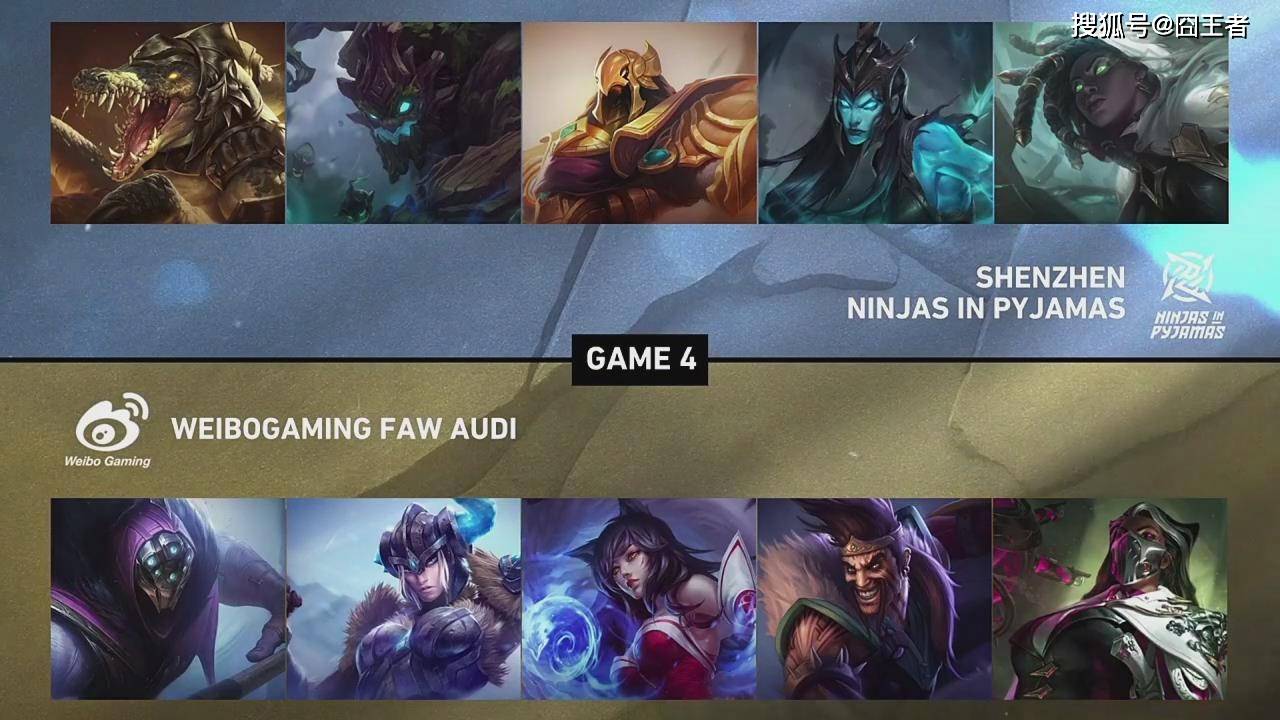 结果两次吃到前期大亏的NIP,在第四局中学聪明了,他们在第5分钟,将入侵自家野区的猪妹留住后,挡住了WBG开局三板斧。随后比赛僵持到16分钟左右,Rookie沙皇进场配合队友将德莱文秒掉后,NIP完成一波1换4好团,直接打开了僵持的局面;随后NIP顺风顺水的,在27分36秒,NIP集火防御塔,一波扳平比赛,双方进入决胜局。
