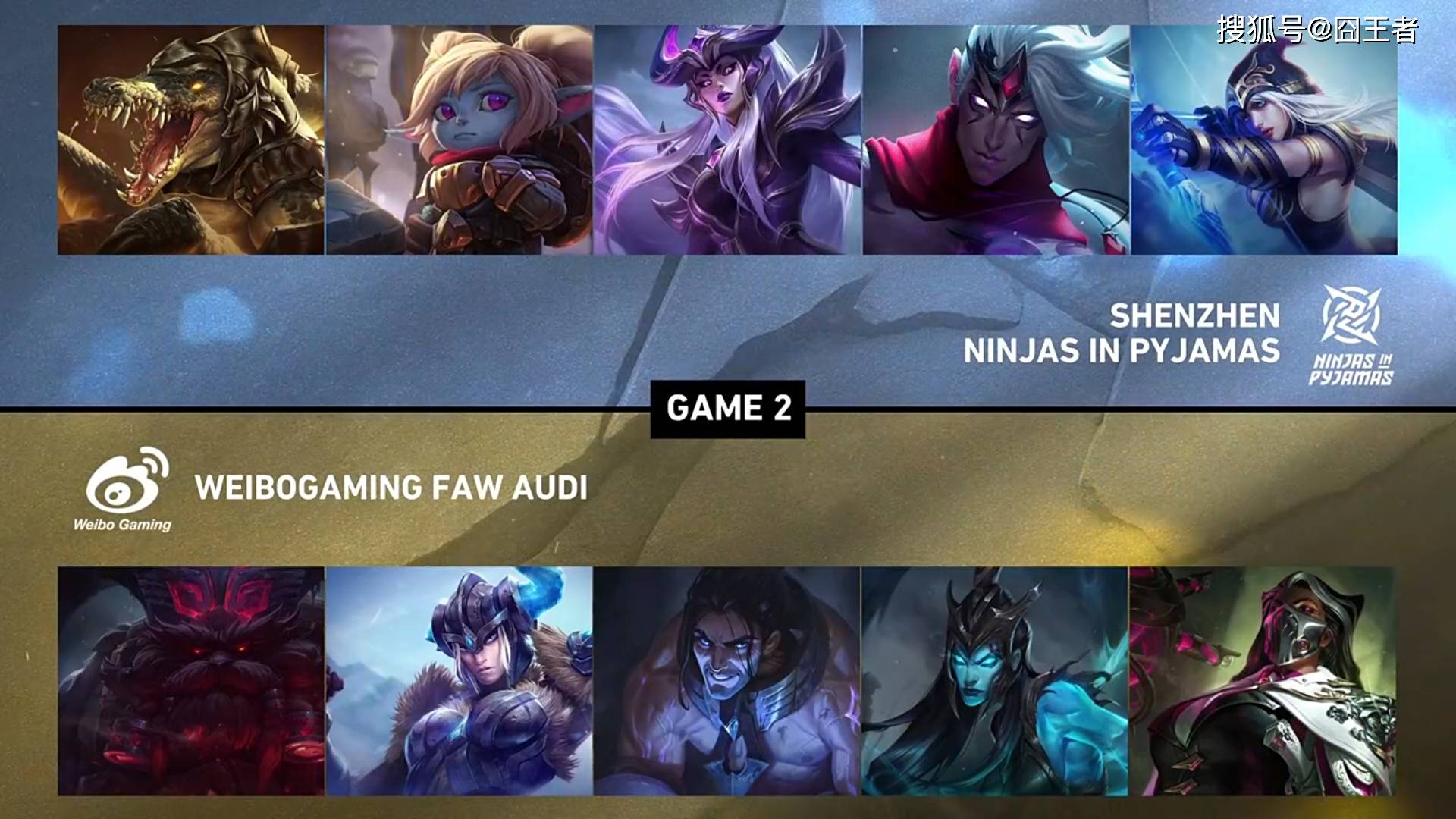 第二局比赛,NIP蓝色方,禁用梦魇,盲僧,武器大师,奎桑提,阿卡丽,选用鳄鱼、波比、辛德拉、韦鲁斯、艾希;WBG红色方,禁用妖姬,兰博,发条,沙皇,妮蔻,选用奥恩、猪妹、塞拉斯、滑板鞋、烈娜塔。