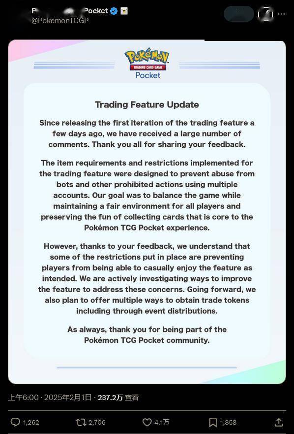 最近推出的热门手游《宝可梦TCG手游》开发商 DeNA和发行商宝可梦公司日前在社交媒体上回应了游戏最近推出的交换/交易功能引发的玩家不满。