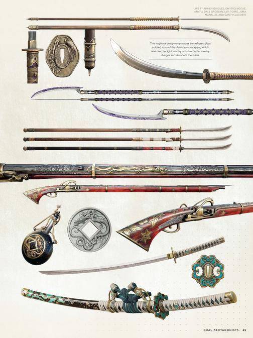 艺术集共有 264 页,其中不乏一些此前已经看到过的艺术图,包括哪些因为使用了未经授权现代火枪队标志不得不进行修改的艺术图(下图1为修改前版本,右侧标志为现代存在的一支火枪队的标志),但同时也有许多此前从未见过的艺术图。只能说就目前来看,艺术图中的许多场景并没有很好的在游戏内体现出来,又或是预告并没有展示他们。另外,艺术集自然也包含了艺术家对两位主角、武器和时代环境更加详细的见解和设定细节。